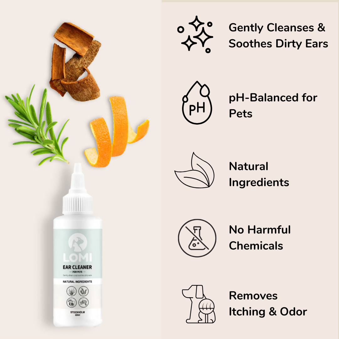 Effektiv och skonsam naturlig öronrengöring för husdjur. Tar bort smuts, klåda, öronvax och dålig lukt utan irritation. Skonsam och fuktgivande formula med neutralt pH för hund och katt. Håll ditt husdjurs öron rena och friska! SGS Certifierad & kliniskt testat.