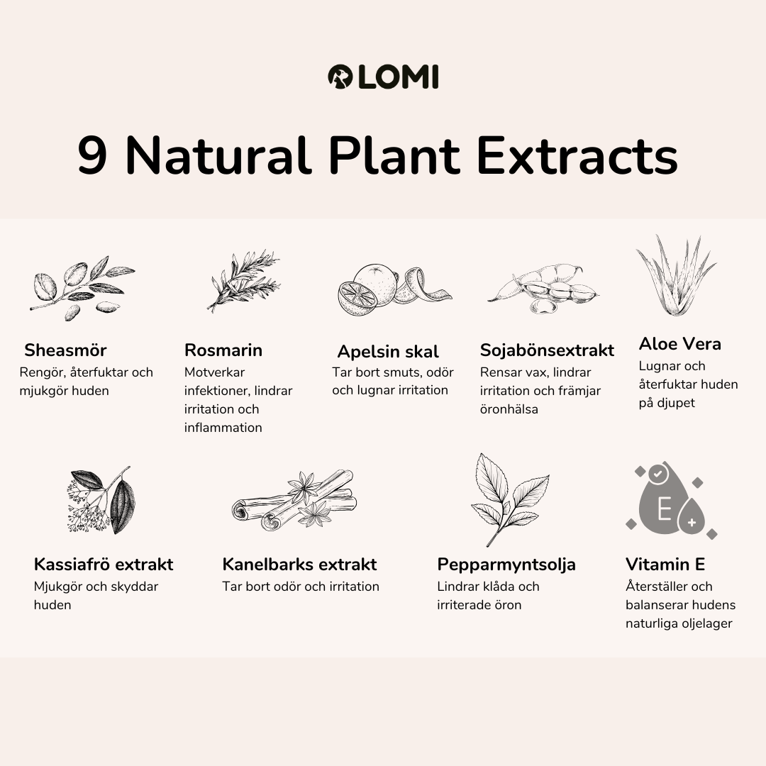 • Tar bort smuts, klåda, öronvax och dålig lukt.