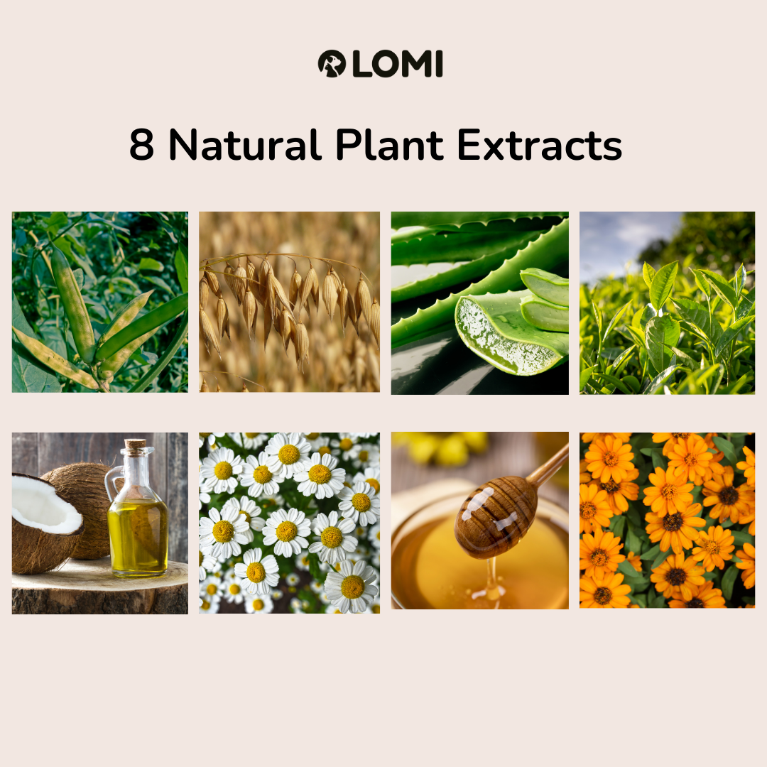 Kamomill, Havre, Ringblomsolja, Ekologisk Kokosnötsolja, Honung, Aloe Vera, Guar Växt och Grönt Te.